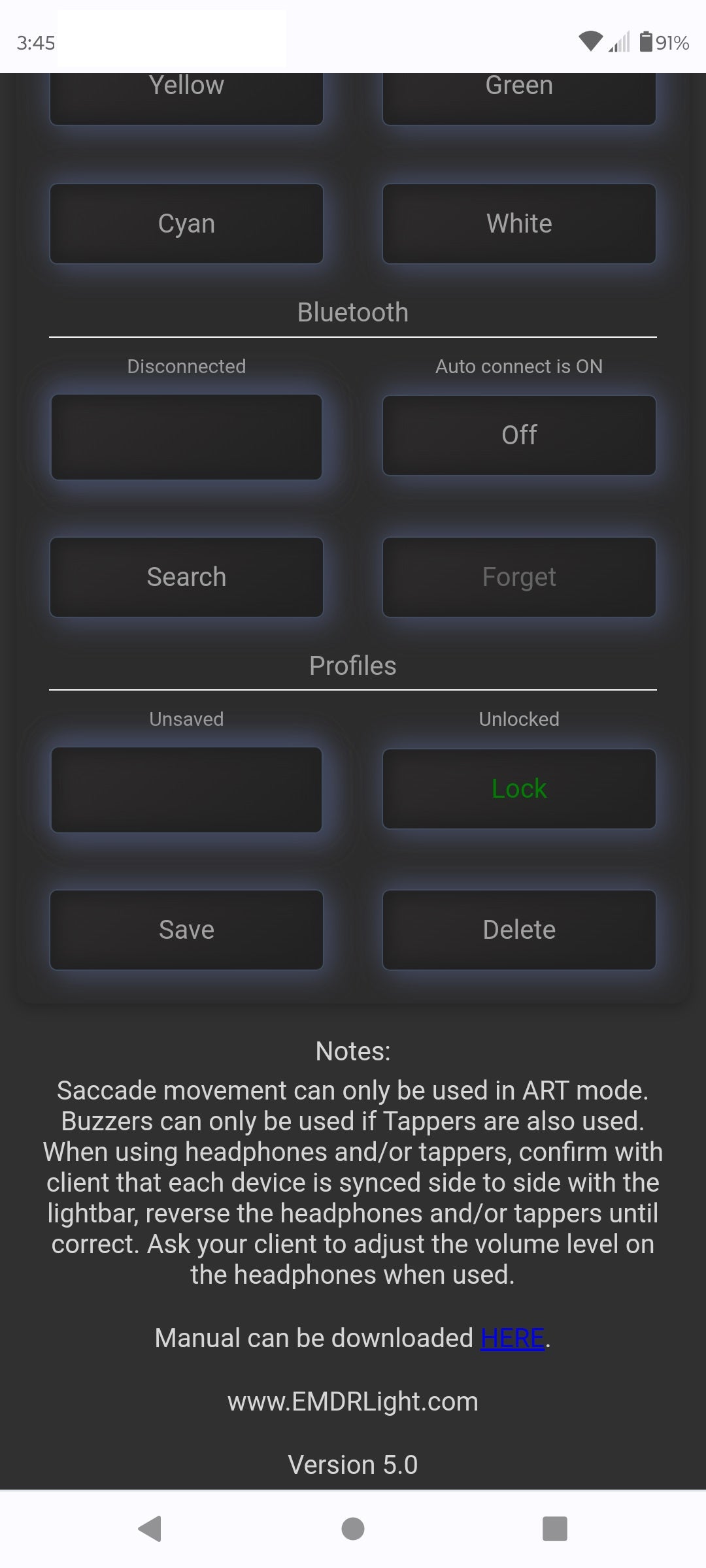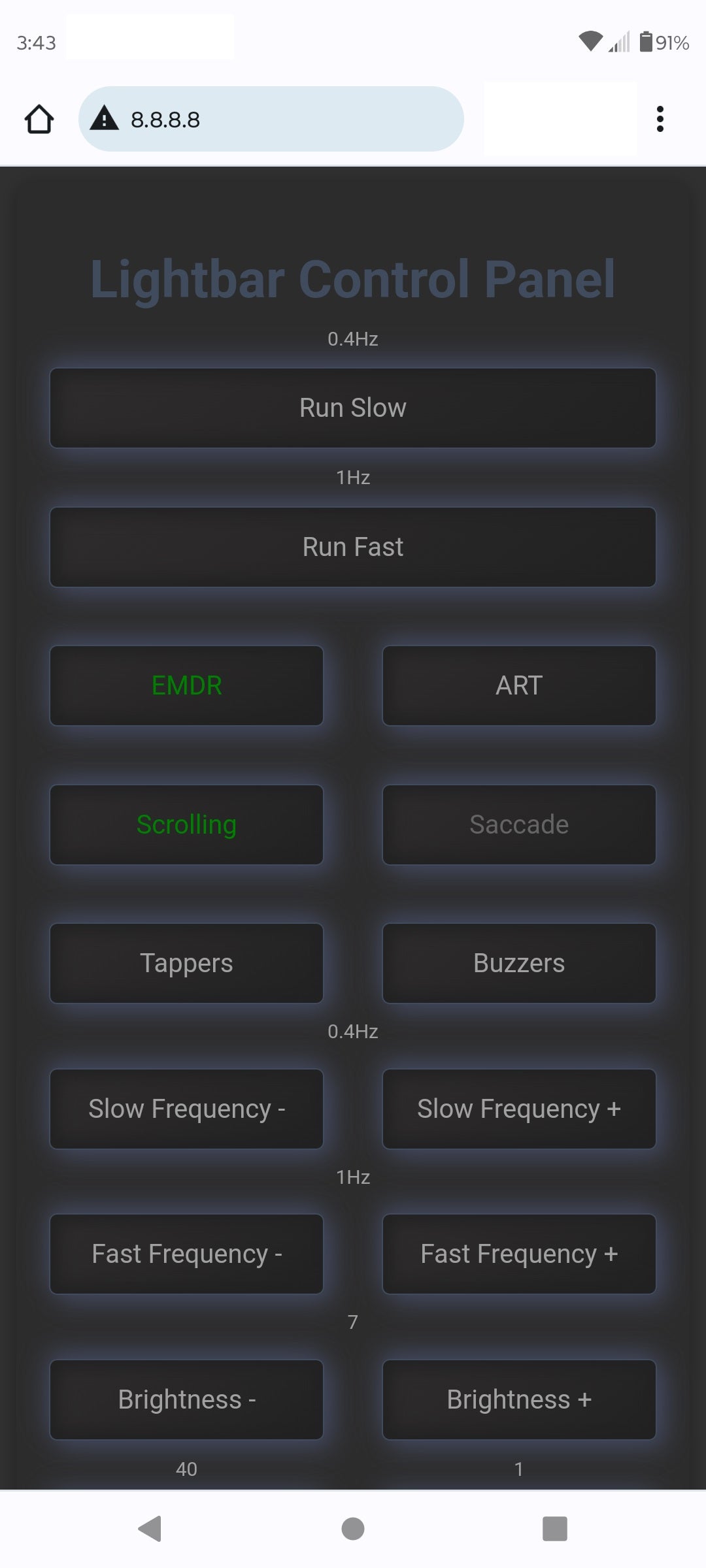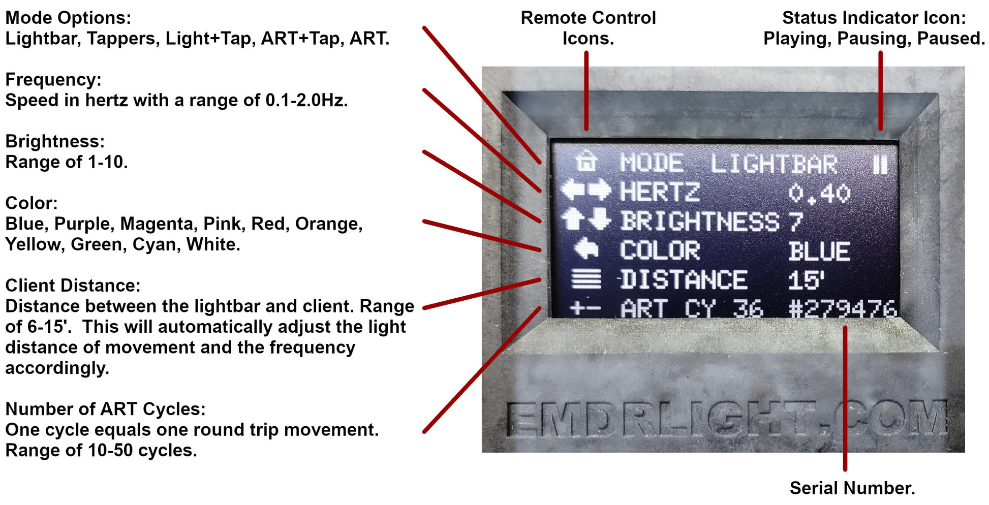 The lightbar has two primary modes: EMDR – which scrolls until paused, and Cycles – which scrolls a user set number of cycles and then automatically pauses. The light itself can be operated as scrolling or saccade.